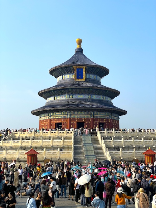 15 Uhr Ein kurzer Taxi- oder Didi-Trip bringt dich zum nächsten Höhepunkt: dem Tempel des Himmels, einer der heiligsten Stätten des alten Chinas. Der Himmelstempel liegt in einem riesigen Park und ist besonders für seine harmonische, runde Architektur bekannt – ganz anders als die strenge Geometrie der Verbotenen Stadt. Am bekanntesten ist die Halle des Erntegebets, ein prachtvoller Rundbau mit himmelblauer Kuppel und drei Dächern, die aufeinander sitzen. Hier beteten die Kaiser einst für eine gute Ernte – in der festen Überzeugung, dass sie als „Söhne des Himmels“ dafür verantwortlich waren. Der umliegende Park ist wunderschön angelegt, mit Pinienalleen, Altären und Meditationsplätzen.