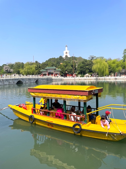 13 Uhr Nach so viel Geschichte brauchst du eine Pause und der perfekte Ort dafür ist der Beihai Park, direkt nördlich der Verbotenen Stadt. Der Park war einst Teil der kaiserlichen Gartenanlagen und ist heute eine ruhige, grüne Oase mit einem See, Pagoden, Brücken und einer weißen Stupa auf der Jade-Insel. Setz dich erst einmal in eines der kleinen Restaurants oder Teehäuser am Wasser. Empfehlenswert ist das Fangshan Restaurant, das für seine imperialen Speisen bekannt ist. Hier wird serviert, was einst am Kaiserhof auf den Tisch kam. Oder du suchst dir etwas Einfaches, z. B. Dumplings oder gebratene Nudeln aus einer der Garküchen – beides ist lecker. Anschließend kannst du entspannt durch den Park spazieren, Boote auf dem See beobachten oder sogar selbst eine kleine Runde auf dem Wasser drehen.